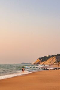 Homem com uma prancha de surf caminhando com uma mulher pela praia